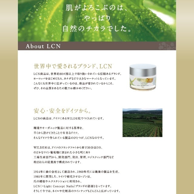 ホワイトティー、オーキッド、ウォーターリリーがアミノ酸、ビタミンCを与え、フリーラジカルから肌を守り、美白・保湿効果で肌をみずみずしく、滑らかに整えます。 またシアバター、ダイズ油、アロエエキスが肌を保護し、乾燥から守ります。 【Natural Care SPA ナチュラル ケア スパ】 エキゾチックな花々、フルーツ、ベジタブル・・・ ジャワ島由来の選び抜かれた植物成分を贅沢に配合したシリーズ。 植物の有効成分と、ふんわりと広がる甘い香りが、あなたのハンド、ネイル、ボディーを包み込みます。 毎日のケアに取り入れて、存分に心と身体を癒しましょう。 『LCN』商品は全てナノ化されているので、肌に浸透し易く、肌表面にベタつきが残りにくくできています。 原産国:ドイツ